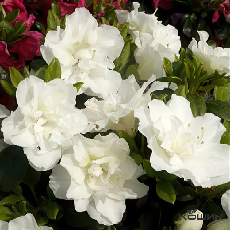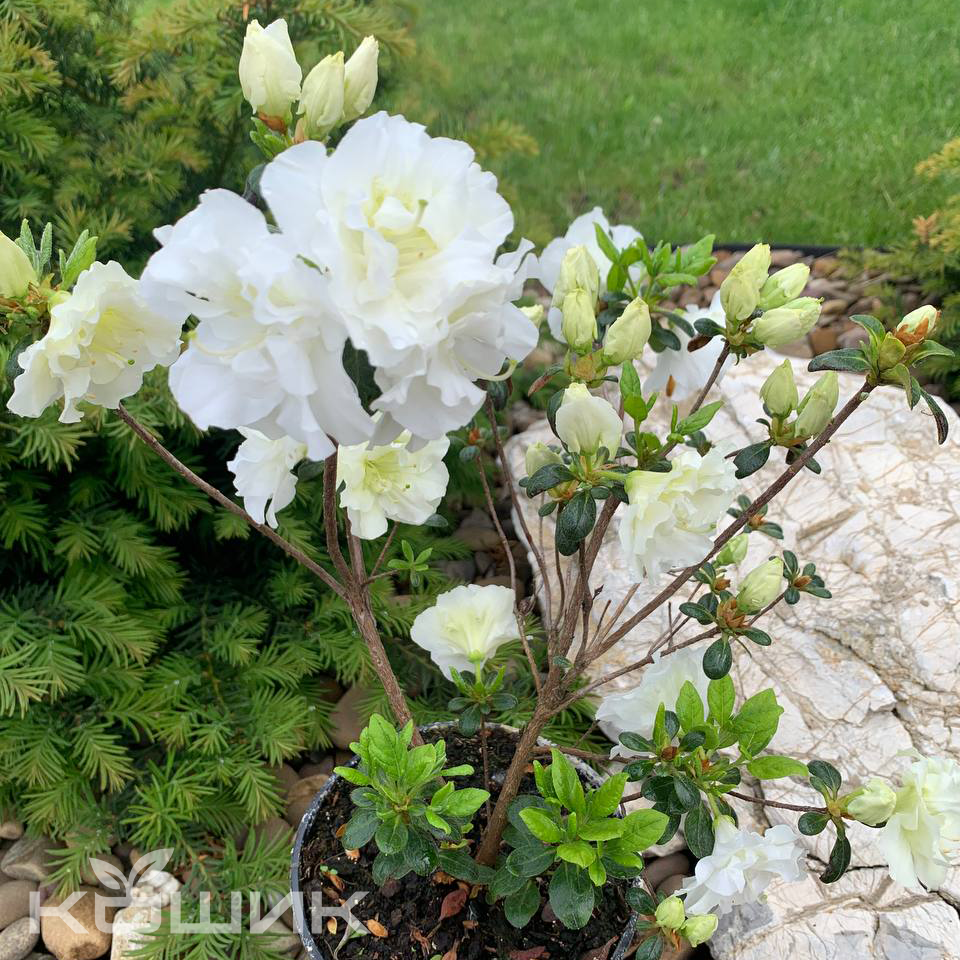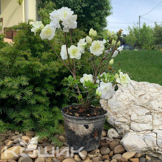 Сезон цвітіння припадає на квітень-травень, коли кущ вкривається безліччю квіток діаметром до 4 см. Їхній м’який білий колір з тонким рожевим серцевиною створює атмосферу витонченості й гармонії, а щільність суцвіть додає рослині об’єму та декоративності. Азалія цвіте довго та рясно, даруючи справжнє весняне свято навіть у найменшому садовому куточку.