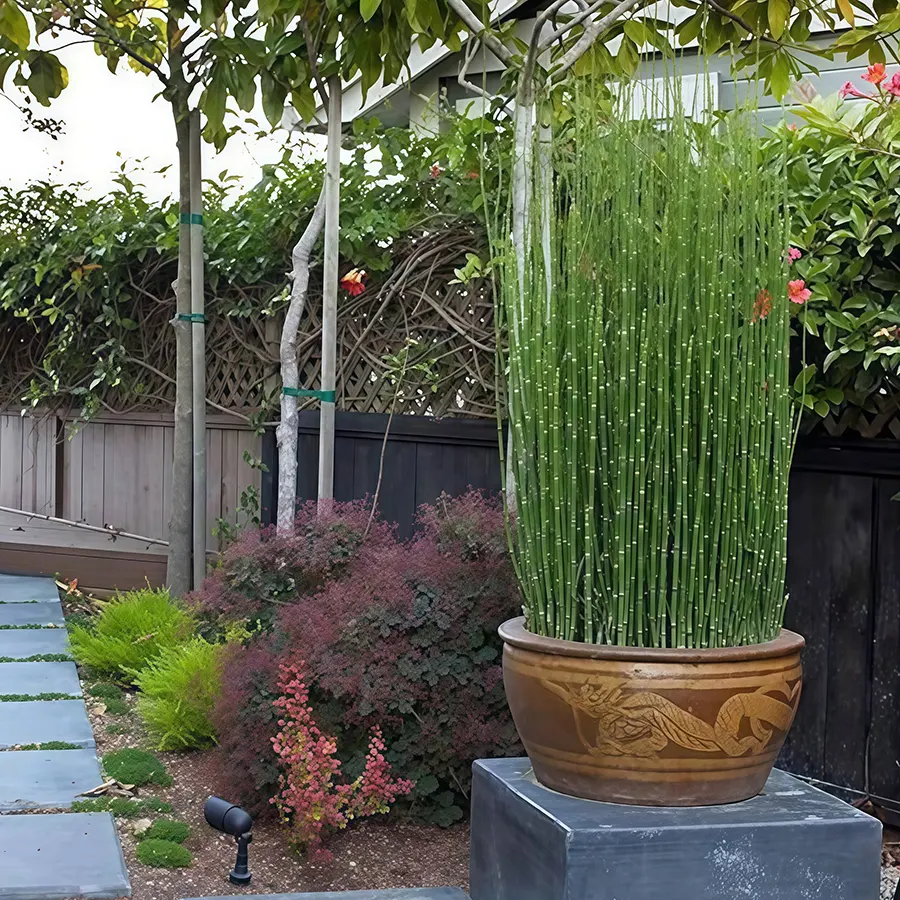 Для клумб та міксбордерів це унікальний елемент дизайну. Гра слів та фактури — текстурні, жорсткі стебла чудово контрастують із м’яким листям багаторічників або папоротей. Вони “підносяться” над сусідніми рослинами, формуючи фон, який підкреслює кольорові плями і об’єми композиції. Також хвощ є чудовим акцентом у сучасних мінімалістичних стилях саду.