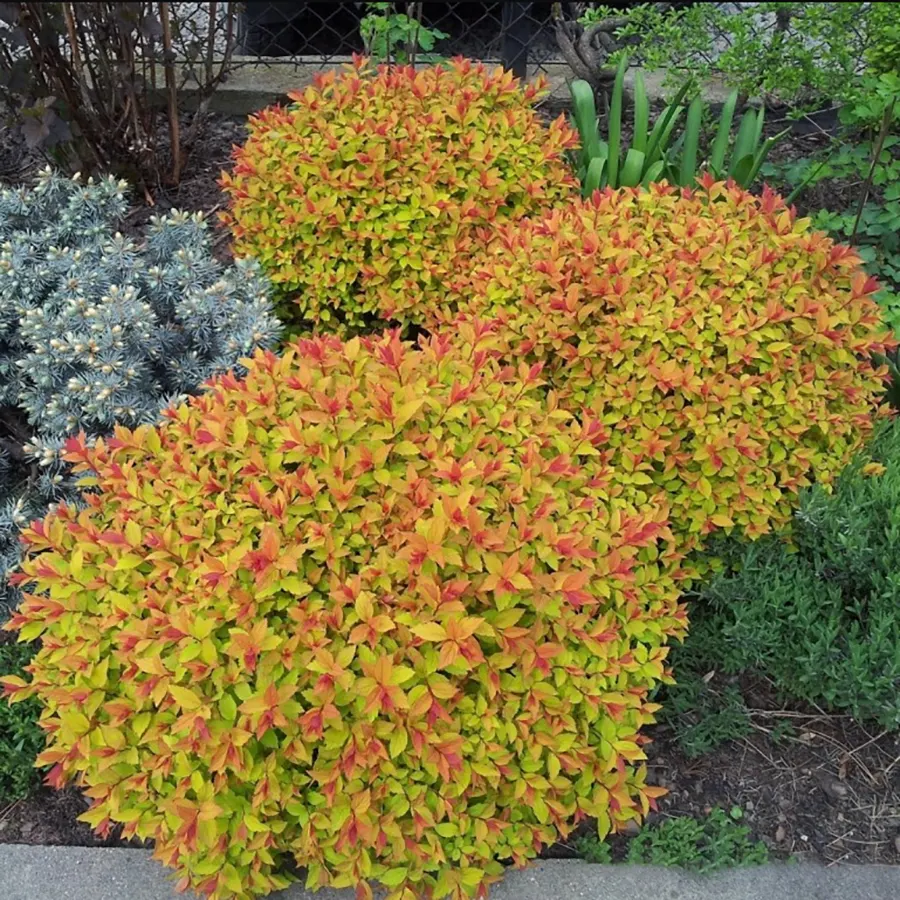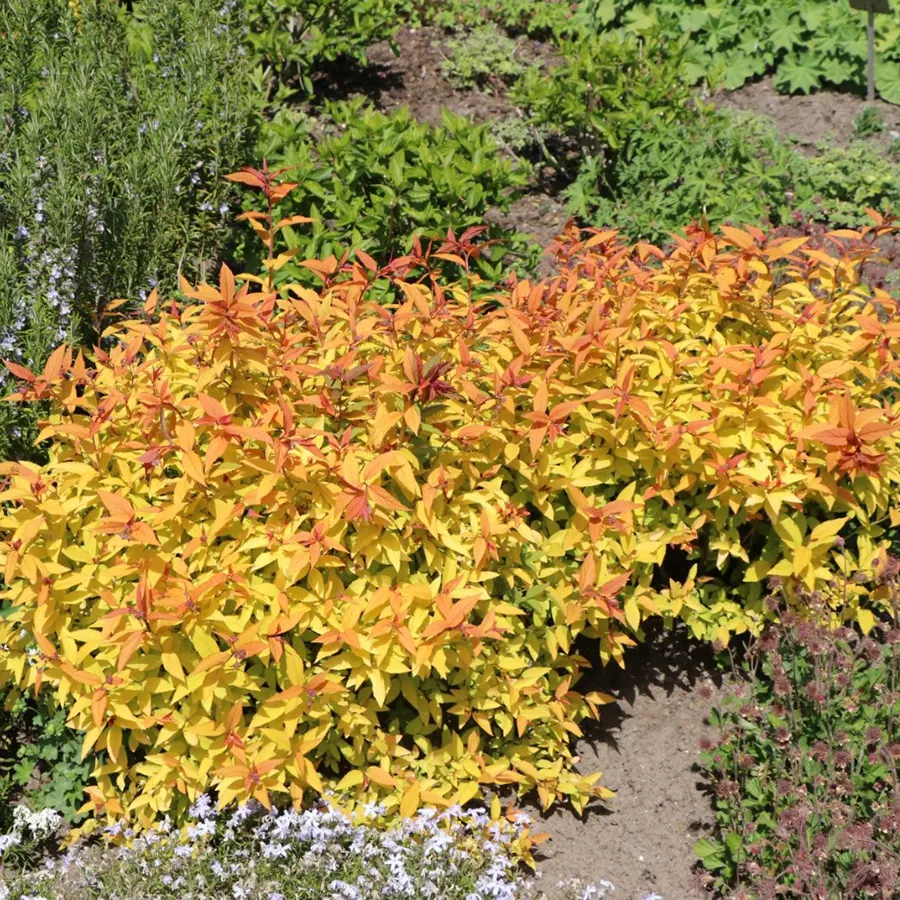 Spiraea japonica ‘Goldflame’ (Спірея японська Голдфлейм, спірея золотисте полум’я, спірея золотиста) – це один із найяскравіших декоративних чагарників, який вражає грою кольорів від весни до пізньої осені. Молоде листя з’являється насичено-бронзово-помаранчевим, улітку стає яскраво-зеленим із золотистим відтінком, а восени набуває вогненно-червоного забарвлення. Завдяки такій зміні кольорів протягом сезону, кущ виглядає по-новому у кожну пору року.